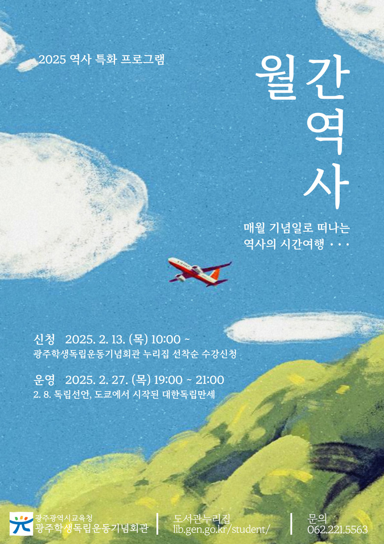 2월 강연 신청은 오는 25일까지 광주학생독립운동기념회관 누리집(http://lib.gen.go.kr/student)에서 회원가입 후 할 수 있다. 선착순 30명을 모집하며 참가비는 무료이다. 자세한 내용은 광주학생독립운동기념회관 누리집을 참고하거나 문헌정보과(062-221-5563)로 문의하면 된다.