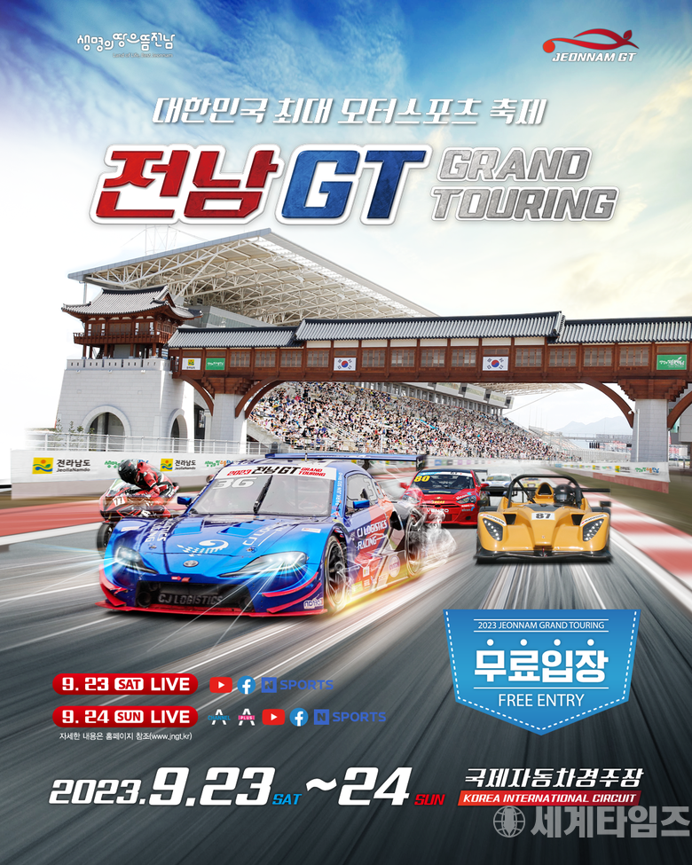 [세계타임즈=방춘재 기자] 국내 최대 모터스포츠 축제 ‘2023 전남GT(Grand Touring)’가 1년 만에 돌아온다. 전남GT가 오는 23일과 24일 전라남도 영암군에 위치한 코리아 인터내셔널 서킷(KIC)에서 열린다. 지난해와 동일하게 상설코스(1랩 3.045km)가 아닌, 풀코스(1랩 5.615km)로 진행된다.
