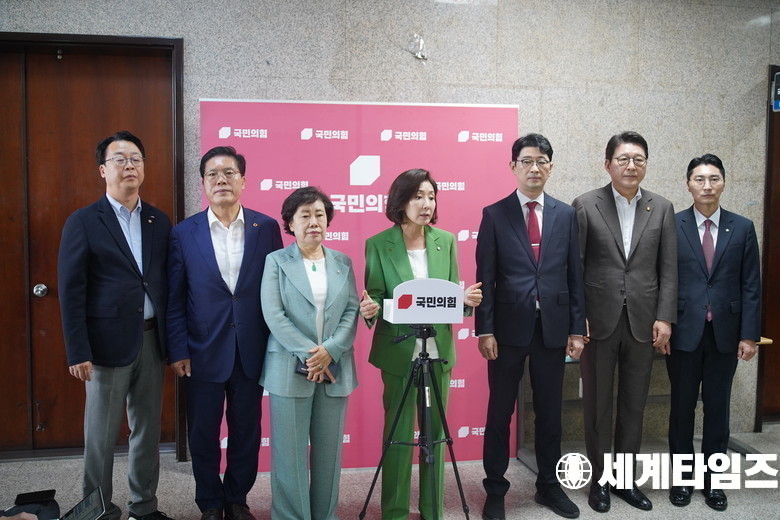 국회 법제사법위원회 국민의힘 '나경원' 의원과 법사위 의원들이 2일 서울 여의도 국회에서 추미애 법사위원장의 일방적인 운영을 규탄하는 기자회견을 하고 있다.