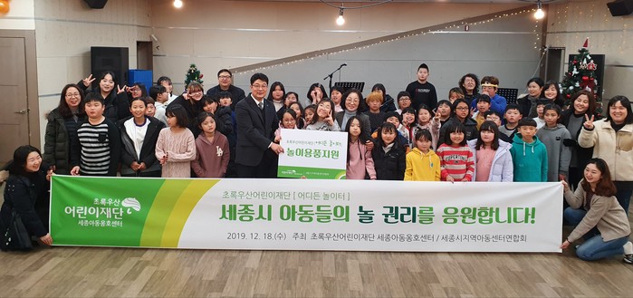 [어디든 놀이터]는 모든 아동들이 차별 없이 놀 권리를 누릴 수 있도록 가정, 학교, 지역사회가 함께 아동이 원하는 놀이와 공간을 제공하고, 아동친화적인 놀이 정책과 제도 수립을 촉구하는 초록우산어린이재단의 아동 놀 권리 보장 캠페인으로, 이 날 양 기관은 아동의 놀 권리 보호와 증진을 위해 상호 업무협약을 맺고 세종아동옹호센터는 세종시 읍·면·동 지역에 위치한 13개 지역아동센터 이용 아동을 위해 다양한 놀이용품을 지원하는 뜻 깊은 시간을 가졌다.