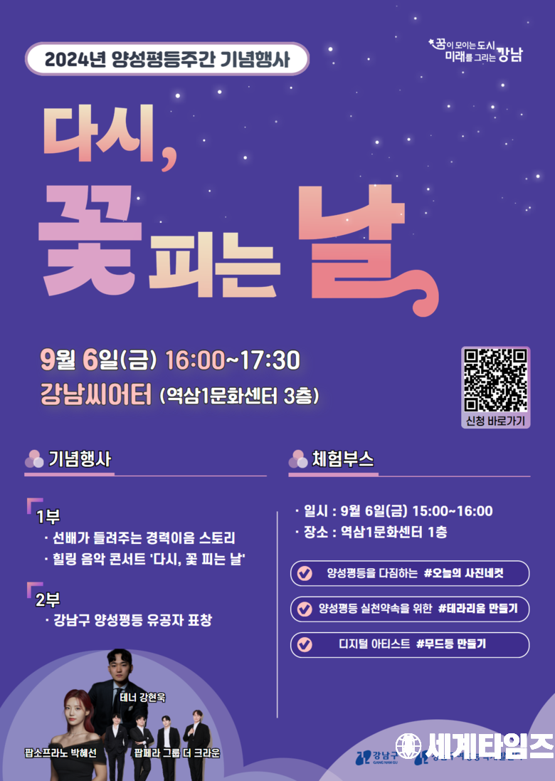 꿈이 모이는 도시, 미래를 그리는 강남구(구청장 조성명)가 오는 9월 6일오후 4시~5시 30분 역삼1문화센터 3층 강남씨어터에서 양성평등주간 기념행사 ‘다시, 꽃 피는 날’을 개최한다.