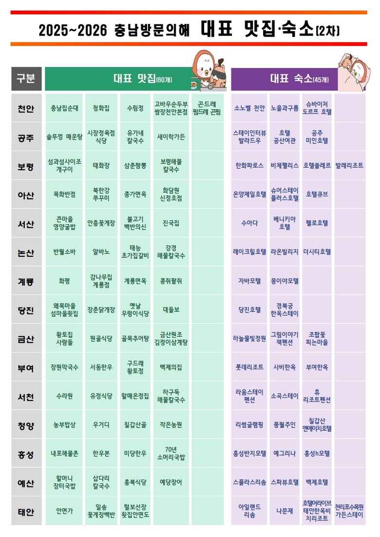 선정 맛집과 숙소는 앞으로 충남관광 누리집, 관광 안내책자, 온라인 홍보 콘텐츠 등 다양한 채널을 통해 소개할 예정이며, 지역 관광핵심 콘텐츠로 활용할 방침이다.