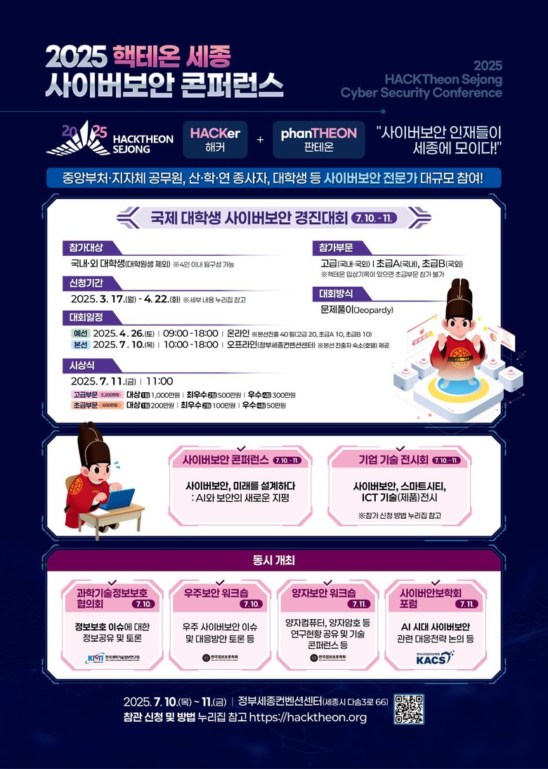 - 사이버보안 콘퍼런스·학술대회·기업 기술 전시회 등 선봬 - [충남 세계타임즈=이채봉 기자] 인공지능(AI) 시대 사이버보안의 미래를 설계하는 ‘2025 핵테온 세종(HackTheon Sejong) 사이버보안 콘퍼런스’가 오는 7월 10일부터 11일까지 이틀간 정부세종컨벤션센터에서 열린다.