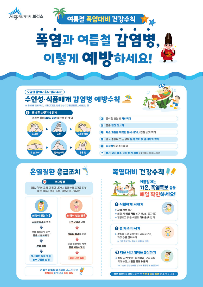 세종시보건소 관계자는 “폭염과 감염병에 취약한 시기인 만큼 시민들께서 예방 수칙을 잘 실천해 건강한 여름을 보내시길 바란다”며 “보건소도 질환이 발생하지 않도록 지속적인 홍보와 예방 활동에 최선을 다하겠다”고 전했다.