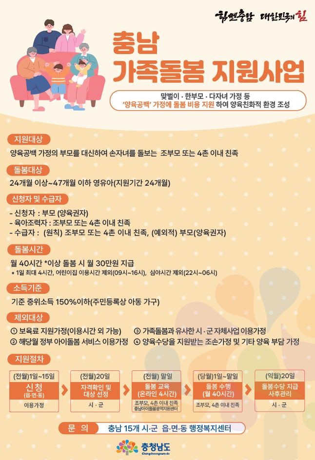 부모 중 한 명과 아동이 도내 거주해야 하며, 조부모 등 4촌 이내 친족(육아 조력자)이 월 40시간 이상 돌봄을 제공하는 경우 월 30만 원의 수당을 지급한다.