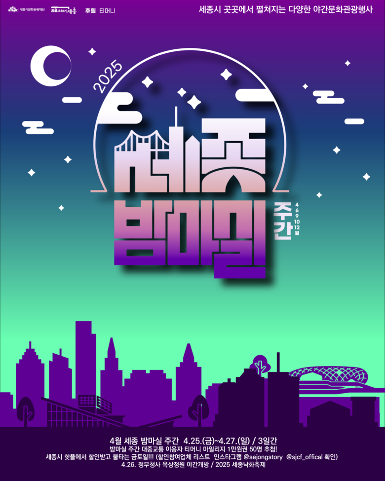 이와 함께 세종시 밤마실 주간에 대중교통을 이용하면 추첨을 통해 1만 원 상당의 티머니(T-Money) 마일리지 혜택을 제공한다.