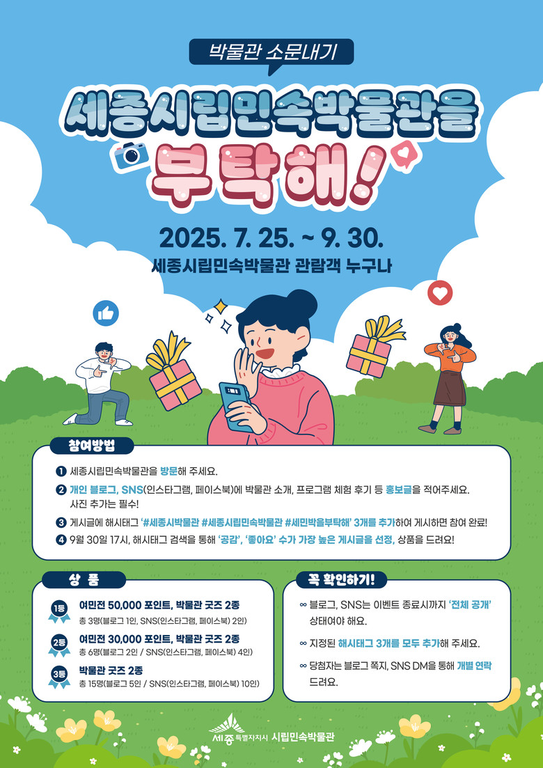 게시글을 필수 해시태그인 ‘#세종시박물관, #세종시립민속박물관, #세민박을부탁해’와 함께 게재하면 자동으로 응모가 완료된다.