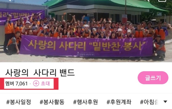[대전=세계타임즈 이장성 기자] SNS에서 봉사를 목적으로 2016년 8월 8일 시작한 대전시 봉사단체 사단법인 사랑의 사다리 밴드(리더 이정제)가 7월 28일 오후6시, 밴드개설 23개월 만에 7천명 회원가입을 달성하는 대기록을 세우면서 지역봉사의 새로운 역사를 쓰고 있어서 화제가 되고 있다.