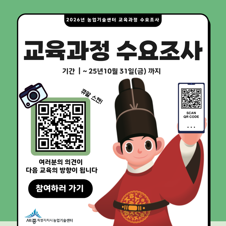조사 참여는 세종농업기술센터에 직접 방문하거나 센터 누리집(sejong.go.kr/adtc.do), 카카오톡 채널, 홍보물 정보무늬(QR 코드) 등에서 하면 된다.