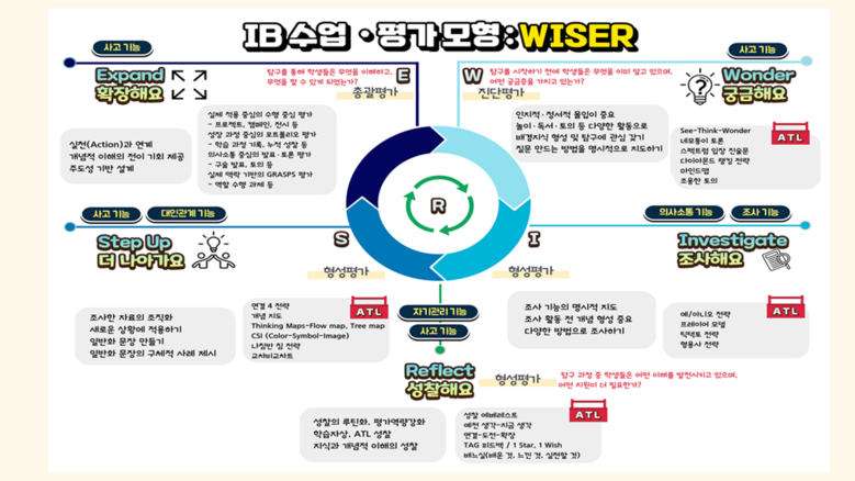 * IB PYP 인증학교: IB로부터 인증을 받아 IB PYP(Primary Years Programme, 초등 교육과정) 프로그램을 공식 운영하는 학교 - 교육과정: 국가 교육과정에 PYP 프레임워크를 접목하여 탐구단원 및 학교별 탐구프로그램 구성 - 학습평가: 교수학습을 지원하기 위해 학습과정과 결과를 총체적으로 평가하는 성장중심평가 운영 - 교수언어 및 운영방식: 자국어(한글) 및 학교 전체 운영 |