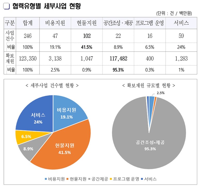 협력유형별로는 현물지원이 102건으로 사업 건수가 가장 많았지만, ‘공간조성·제공’이 1,175억 원으로 압도적이었다. 강남의 높은 부동산 비용 구조를 고려할 때, 민간의 공간을 상시 활용해 생활 인프라를 확대한 방식이 예산절감 효과를 크게 끌어올린 것으로 분석됐다.