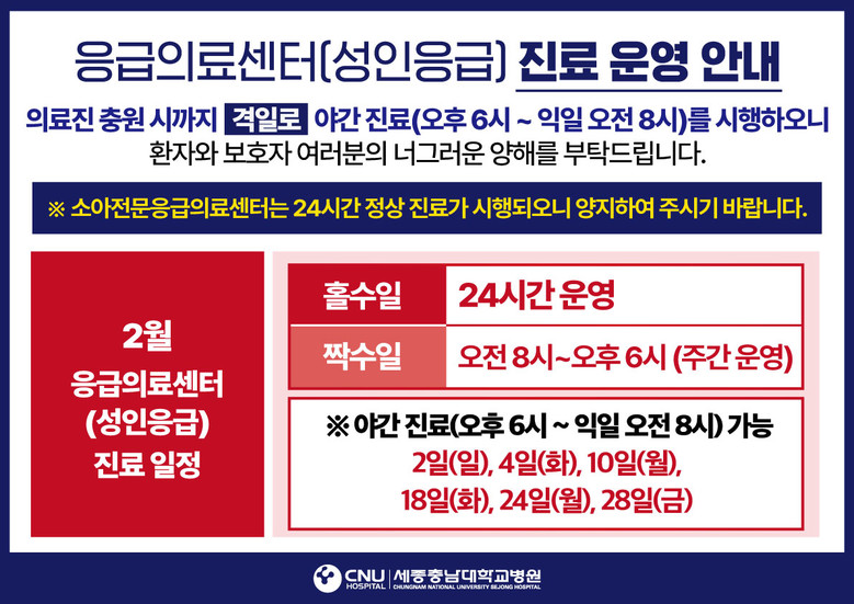 세종충남대병원은 응급의료전문의사 인력 부족으로 지난 1월 홀수일에는 24시간 진료하고 짝수일에는 주간만 운영해 왔다.