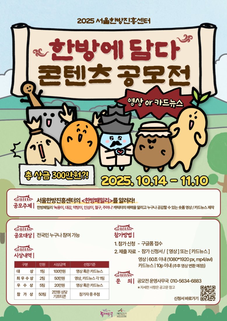 - 총 상금 300만원 및 다양한 혜택 제공…오는 11월 10일까지 참가자 모집 [동대문구 세계타임즈=이장성 기자] 서울 동대문구(구청장 이필형)는 한방산업특구 서울약령시에 위치한 서울한방진흥센터(서울약령시한의약박물관)가 ‘2025 한방에 담다 콘텐츠 공모전’을 개최한다고 밝혔다.