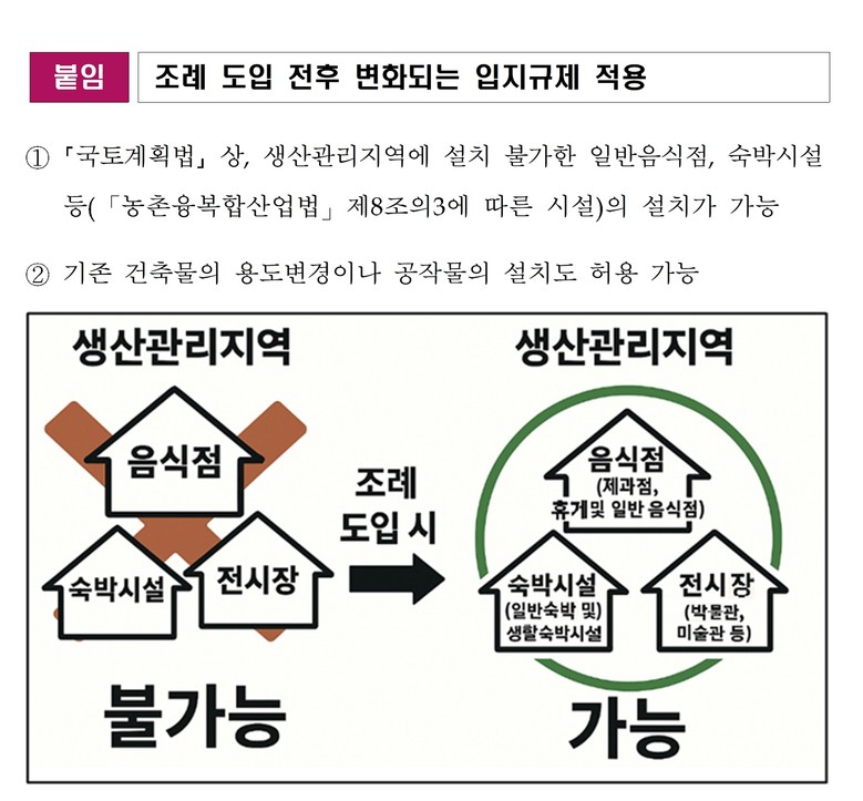 하지만 농촌 경제 침체 여건과 농촌융복합산업 경영체의 사업 다각화에 어려움이 많다는 현장의 의견에 따라 이번 조례를 통해 ‘국토의 계획 및 이용에 관한 법률’ 특례를 도입했다.