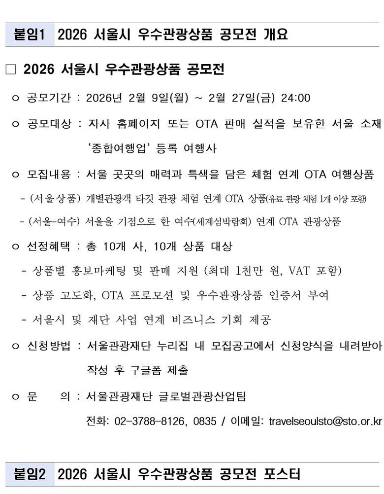 공모전 참여를 희망하는 여행사는 오는 2월 27일(금)까지 온라인으로 신청할 수 있으며, 공모전과 관련한 자세한 정보는 서울관광재단 누리집 ‘모집공고’(https://www.sto.or.kr/unitrcrit)에서 확인할 수 있다.
