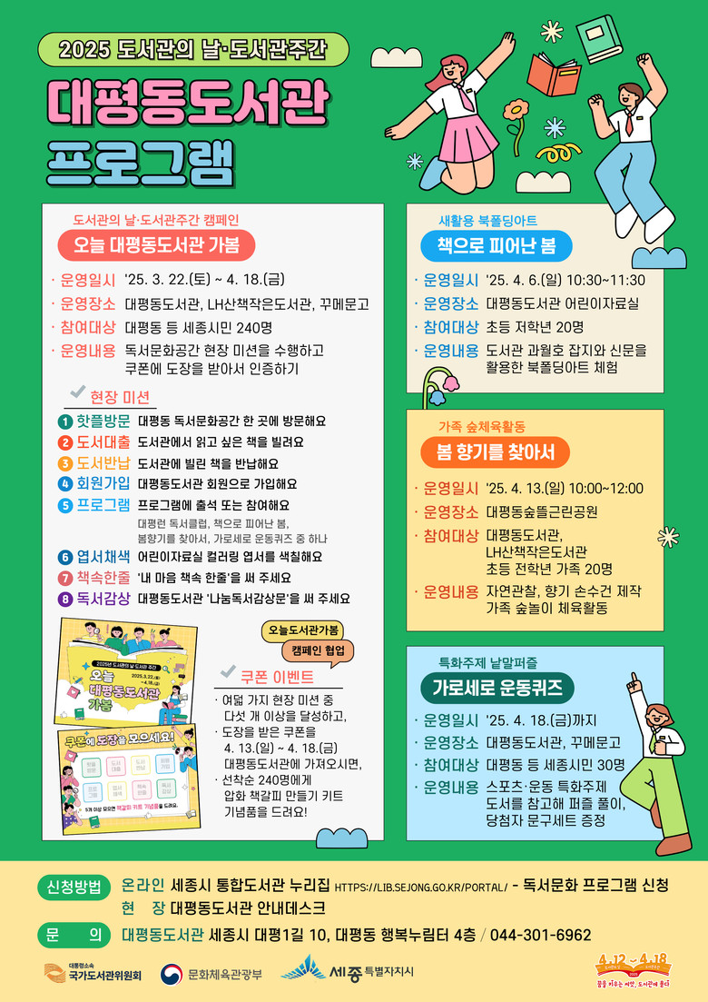 상세한 프로그램 문의는 대평동도서관(☎ 044-301-6962)으로 하면 된다.