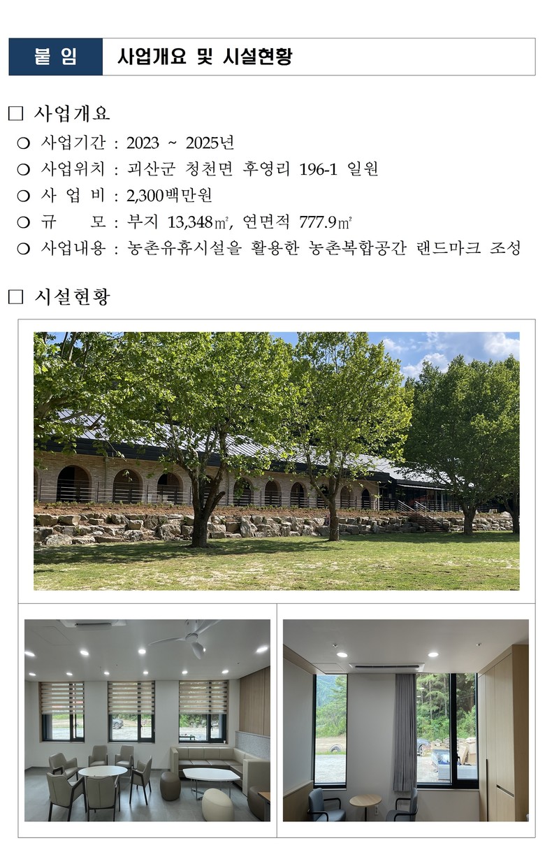 충청북도 관계자는 “이번 사업은 버려져 방치되고 있는 농촌유휴시설 활용에 대한 모델을 제시하는 중요한 사례”라며, “농촌 유휴시설을 혁신적으로 활용하는 다양한 프로젝트를 통해 충청북도와 농촌지역의 발전을 적극 도모 하겠다”고 말했다.