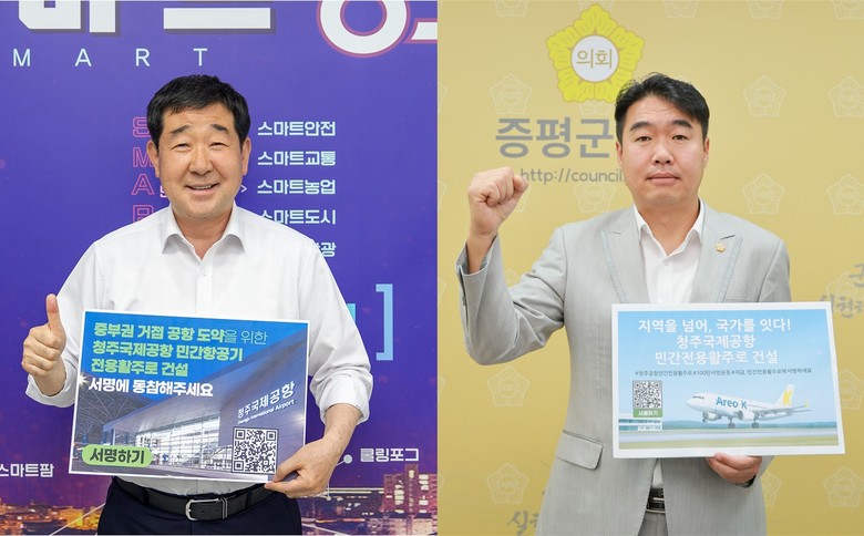 19일, 이재영 증평군수와 조윤성 증평군의회 의장은 ‘청주공항 민간전용활주로 건설, 서명운동 동참’이라는 표어를 들고 릴레이 캠페인에 참여했다.