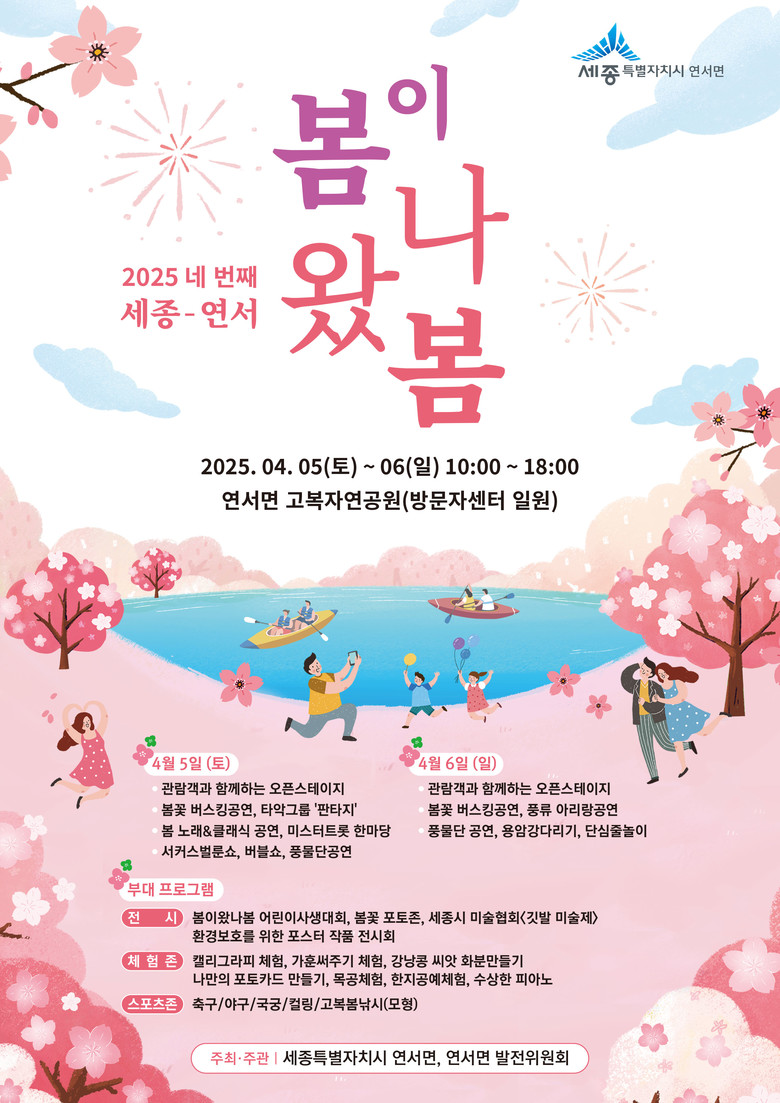 세종특별자치시 연서면발전위원회(공동위원장 한재현·김학용)가 내달 5일부터 6일까지 고복자연공원에서 ‘2025 네 번째 세종-연서 봄이 왔나봄’ 축제를 개최한다.