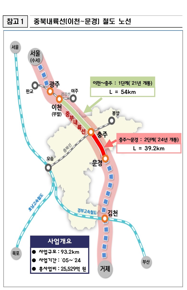 중부내륙선은 철도가 지나가지 않던 지역을 중심으로 총 2조 5천5백억 원의 사업비를 투입하여 93.2km를 잇는 철도 노선으로 2014년에 착공하여 1단계(이천~음성~충주/54km)와 2단계(충주~괴산~문경/39.2km)로 나누어 추진됐으며, 1단계 사업은 앞서 ΄21년에 개통했다.