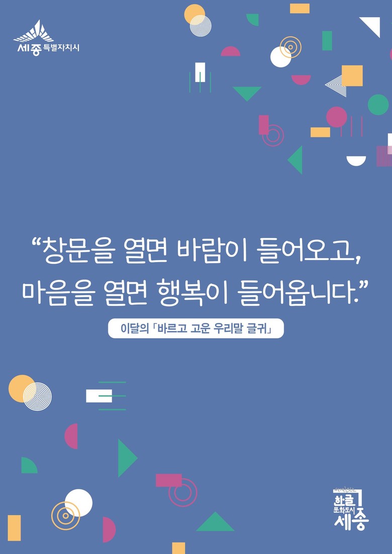 김려수 문화체육관광국장은 “오는 12월까지 한글문화도시 세종의 곳곳에서 예쁜 우리말 글귀들을 만나볼 수 있을 것”이라며 “따뜻한 감성을 담은 글귀를 통해 일상 속 한글의 아름다움을 가득 느껴보시길 바란다”고 말했다.