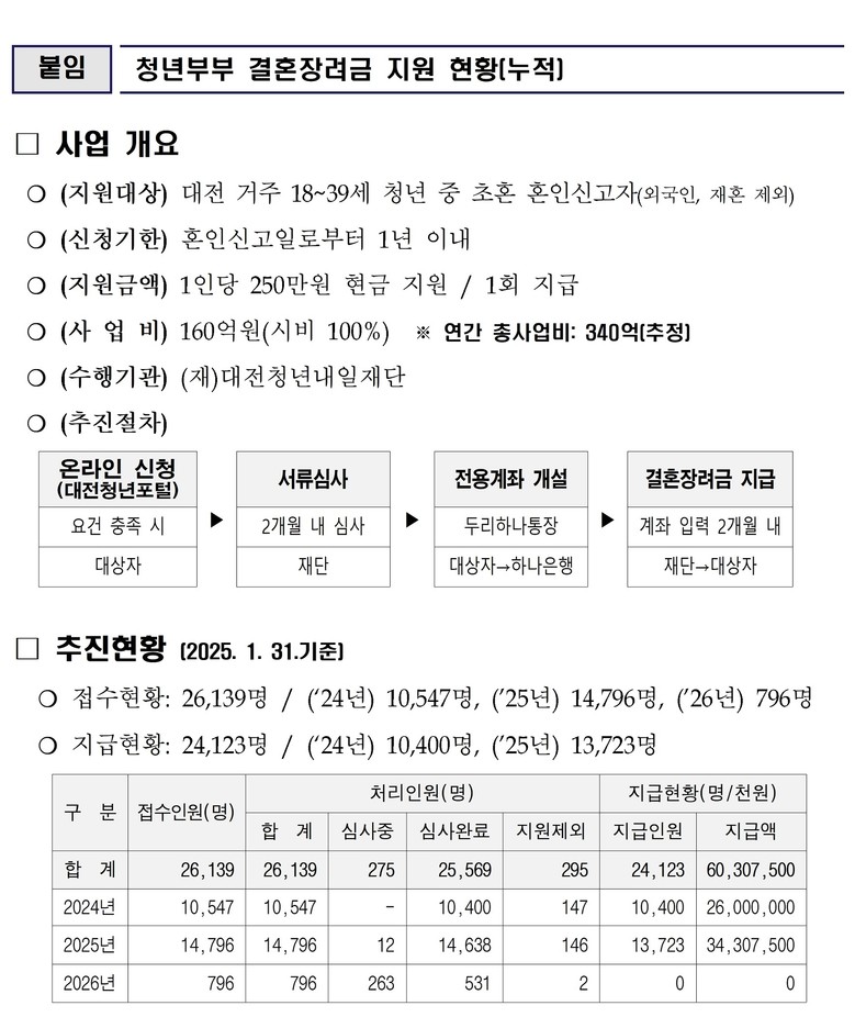 본 사업은 2024년 10월 전국 특.광역시 중 최초로 시행된 청년부부 결혼장려금 제도로, 2026년 1월 말 기준 누적 2만 6,139명이 신청했고, 이 중 2만 4,123명이 지원을 받았다.
