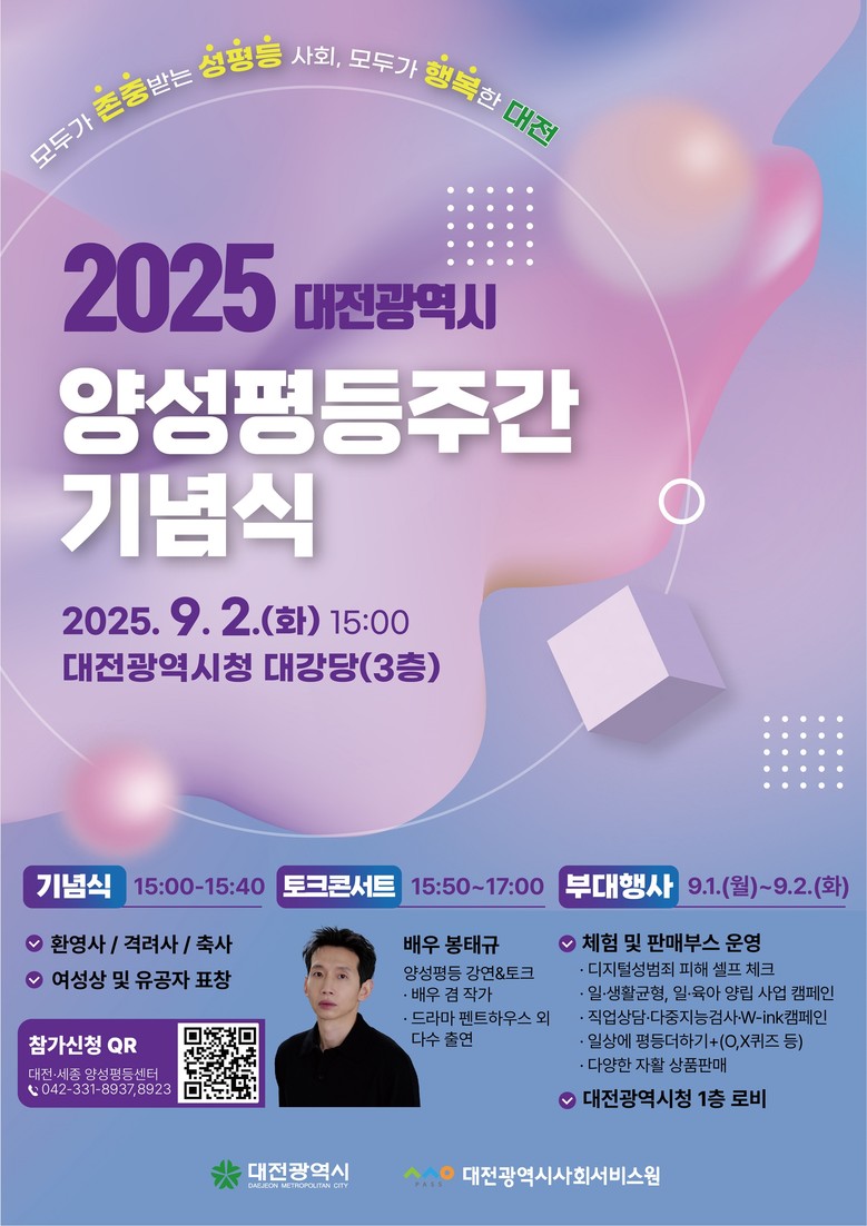 - 2일 기념식에서는 대전여성상 시상과 유공자 표창, 배우 봉태규 특강 마련 - [대전 세계타임즈=이채봉 기자] 대전시는 2025년 양성평등주간을 맞아 오는 9월 1일부터 7일까지 기념주간을 운영하며, 이에 앞서 9월 1일부터 4일까지 시청과 대전YWCA 일대에서 다양한 행사를 개최한다. 올해 행사의 주제는 “모두가 존중받는 성평등 사회, 모두가 행복한 대전”이다.