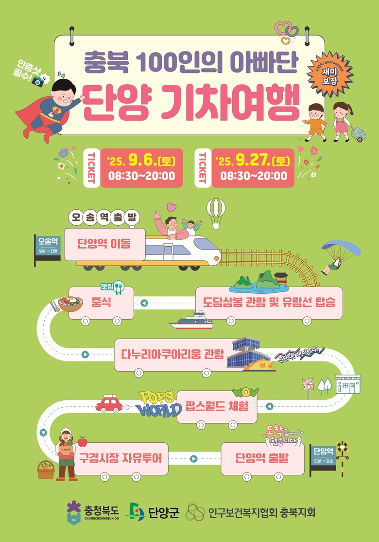 이번 여행에서 참가 가족들은 도담삼봉 유람선 탑승, 다누리아쿠아리움 관람, 팝스월드 체험, 구경시장 자유투어 등 다양한 프로그램을 즐기며 도내 관광지를 새롭게 경험할 예정이다. 특히, 아빠와 아이가 함께 미션을 수행하고 서로를 챙기며 여행을 이어가는 과정은 가족 간 유대감을 더욱 돈독히 하고, 오래 기억에 남을 특별한 하루를 선사할 것으로 기대된다.