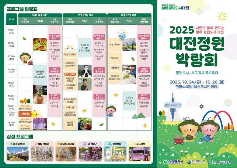 ‘시민과 함께 만드는 일류 정원도시 대전’이라는 주제로 열리는 이번 박람회는 정원 전시, 정원산업전, 문화프로그램, 부대행사 등 다채로운 내용으로 구성되어 정원도시의 비전을 시민들과 함께 나누는 자리가 될 것이다.