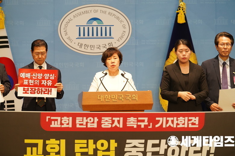 '조배숙' 국민의힘 의원이 11일오후 서울 여의도 소통관에서 손현보 목사 구속 관련 교회 탄압 중지 촉구 기자회견을 열었다.