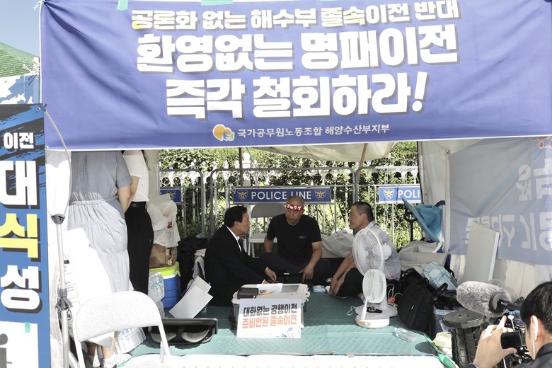 윤병철 위원장은 지난 9일 이곳에서 정부의 해수부 부산 이전 방침을 반대하는 기자회견을 열고 땡볕 속에서 단식 농성을 이어가고 있다.