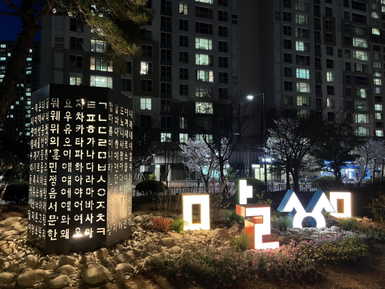 기둥 주변에는 ‘나랏말씀’을 형상화한 자음·모음 조형물과 전통적인 오방색 발광 다이오드(LED) 조명을 배치해 한글의 아름다움을 표현했다.