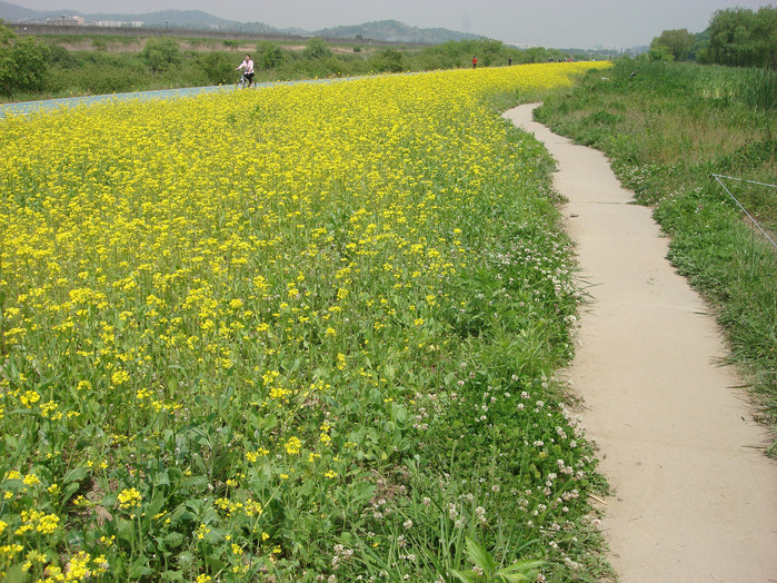 파란 하늘 속 바람결에 일렁이는 노란 유채꽃 물결은 산책 나온 사람들의 카메라에 담겨 도심 속 자연의 아름다움을 전한다.