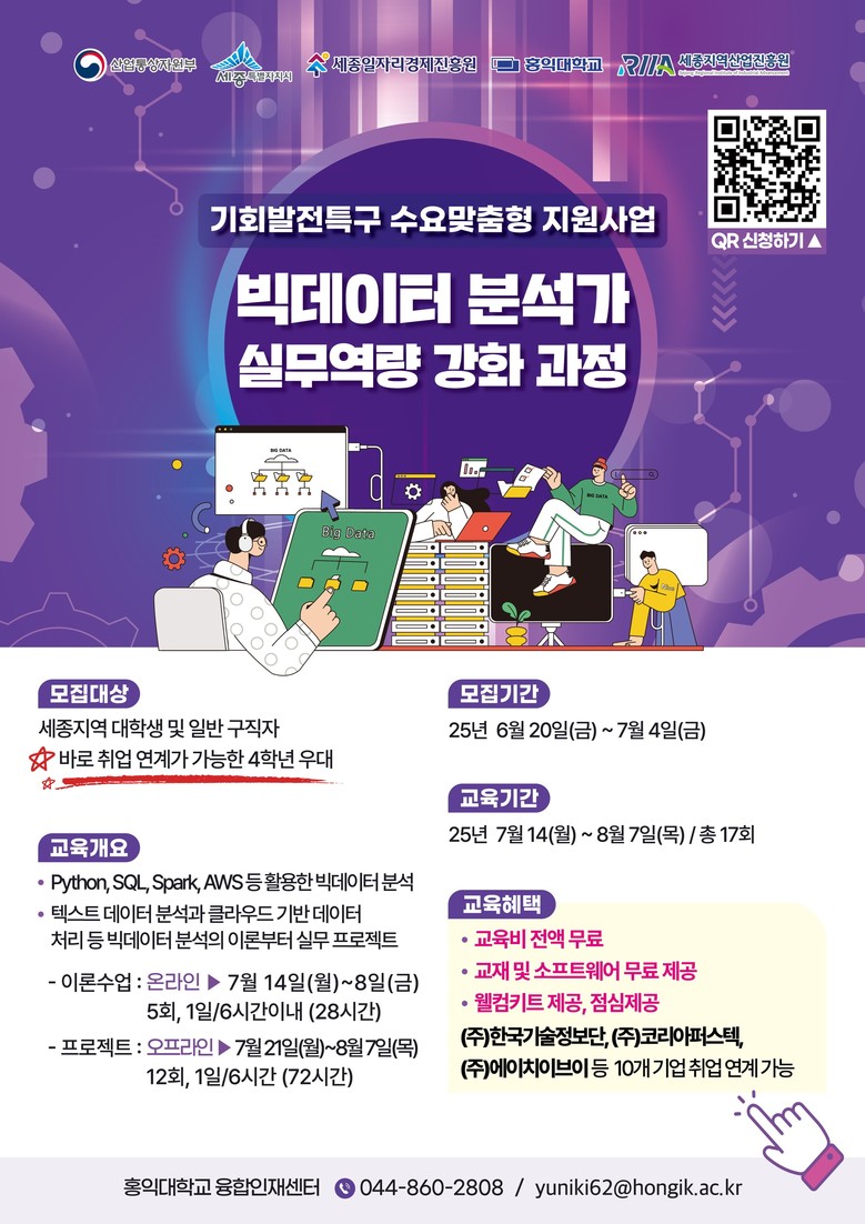 김현기 경제산업국장은 “이번 교육을 통해 세종시 인재들이 빅데이터 분야에서 전문성을 갖추고 지역 기업의 인력 수요에도 부응할 수 있을 것”이라며 “청년 일자리 창출과 지역경제 활성화를 위해 다양한 지원에 나서겠다”고 말했다.