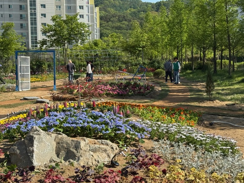‘아이꽃터’는 다양한 계절꽃으로 꾸며져 도심 속에서도 자연의 아름다움을 가까이에서 느낄 수 있는 마을 힐링공간으로 조성됐다.