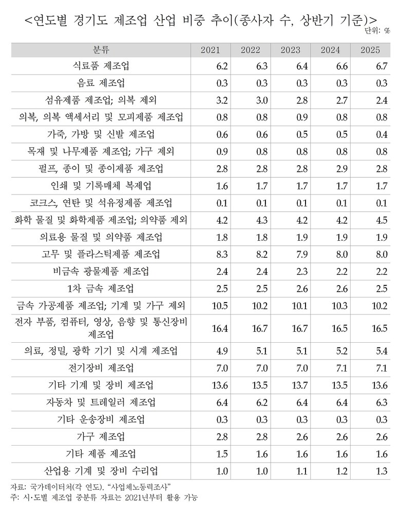 국가데이터처 경제활동인구조사에 따르면 경기도 제조업 취업자는 2018~2019년 감소(2018년 –0.7%, 2019년 –4.7%)한 뒤 2020년부터 증가세로 전환됐다. 2020년에는 1.9%, 2021년에는 4.8% 증가했으며, 2022년에는 코로나19 회복 국면에서 9.2%의 높은 증가세를 보이는 등 도내 제조업 고용이 확대됐다. 그러나 2023년에는 –3.2%, 2024년에는 –4.1% 등 2년 연속으로 제조업 고용이 감소하는 모습을 보였다. 전국 제조업 고용 대비 도내 제조업 고용 비중도 2020년부터 점차 확대되어 왔으나 2022년 약 33% 수준까지 상승한 이후 최근에는 증가폭이 둔화되는 흐름이다.