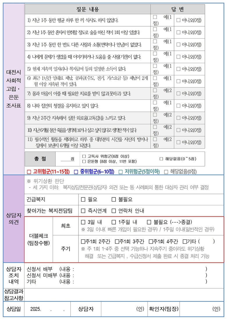 이번 대책의 핵심은 초기상담 강화를 통한 고위험군 조기 선별이다. 동 행정복지센터에서 첫 상담 시 ‘위기상황 판단 체크리스트’와 ‘고립·은둔 조사표’를 활용해 위험도를 정량화하며, 실무자 상담 이후 팀장이 이를 재점검하는 더블체크시스템을 도입해 대응의 정확성과 신속성을 확보한다.