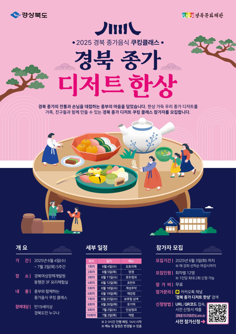 특히, 2024년도에 실시한 ‘경북 종가음식 쿠킹 클래스’가 모집 공고 게시 당일 신청 마감이 되는 등 큰 인기를 얻어 올해는 10회(2024년 5회)로 확대 편성해 운영한다.