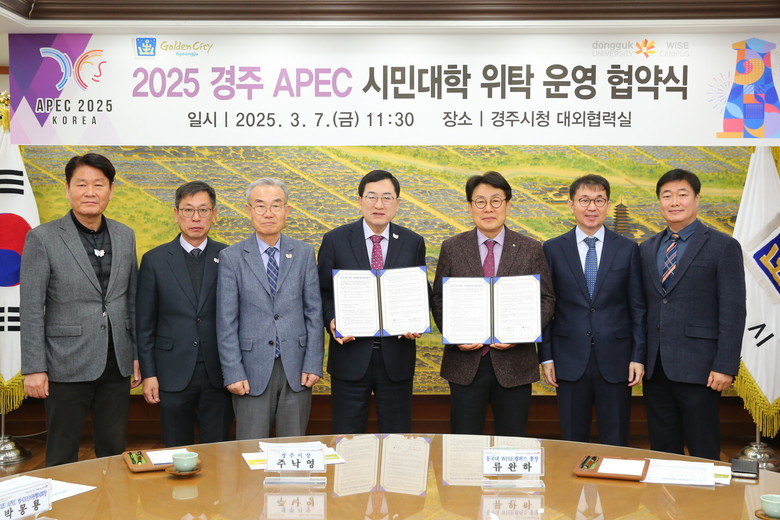 시는 지난 7일 시청 대외협력실에서 동국대학교 WISE캠퍼스와 2025 경주 APEC 시민대학 위탁 운영을 위한 업무협약을 체결하고 운영 방향에 대해 논의했다.