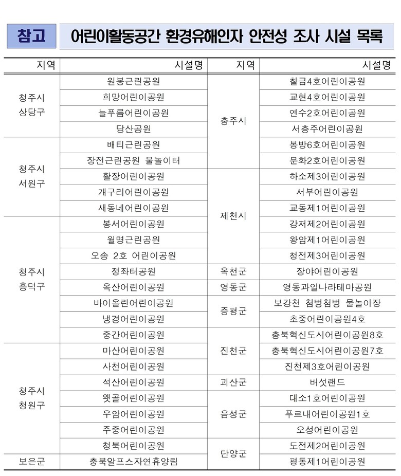 충북보건환경연구원 민윤희 폐기물분석과장은 “환경유해물질에 민감한 어린이들이 안전하게 야외 놀이 활동을 할 수 있는 환경을 만들기 위해 검사 대상을 확대하는 적극 행정을 시행할 것”이라고 밝혔다.