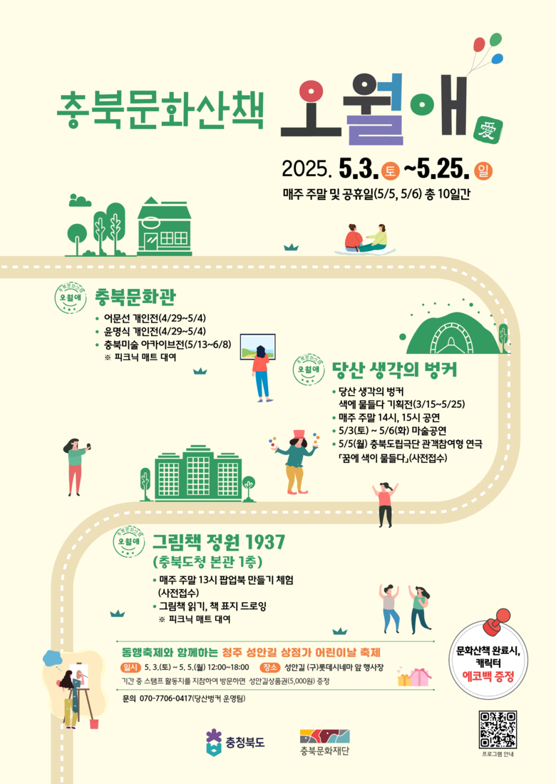 충북도 한충완 문화체육관광국장은 “가정의 달 5월을 맞아 가족과 함께할 수 있는 다양한 문화 프로그램을 준비했다”며 “많은 도민과 관광객들이 충북에서 특별한 봄날의 추억을 만들기 바란다”고 전했다.