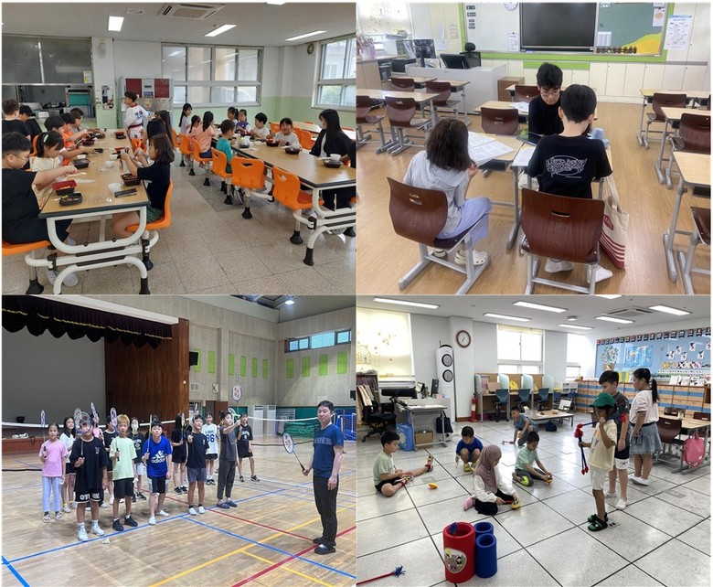 | ▲ 조치원신봉초 학생들이 여름방학 온종일 학생 성장 프로그램에 참여하고 있는 모습(왼쪽 위: 방학 중 급식, 오른쪽 위: 교대·사범대 학생 교육복지 대상 학습 지도, 왼쪽 아래: 스포츠 캠프 오른쪽 아래: 한국어 교실) |