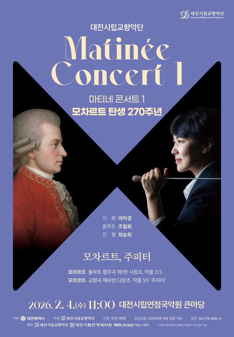 - 4일 첫 무대 여자경 예술감독과 플루트 조철희 수석 협연 - [대전 세계타임즈=이채봉 기자] 대전시립교향악단은 2월 4일(수) 오전 11시, 대전시립연정국악원 큰마당에서 대표적인 기획 시리즈인 ‘마티네 콘서트’의 2026년 첫 무대를 연다.