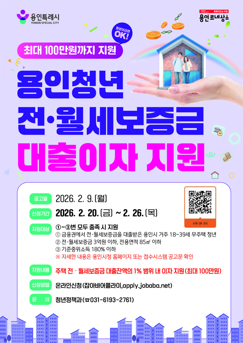 이 사업은 전월세 보증금 대출을 이용 중인 용인에 주민등록을 둔 무주택 18~39세 청년을 대상으로, 대출잔액의 1% 내에서 최대 100만 원까지 이자를 지원하는 제도다.