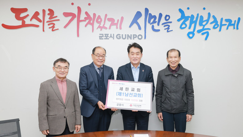 [군포시 세계타임즈=송민수 기자] 군포시는 지난 25일 군포시 산본로에 위치한 세린교회 남성 성도들로 구성된 제1남선교회로부터 현금 150만원을 기탁받았다.