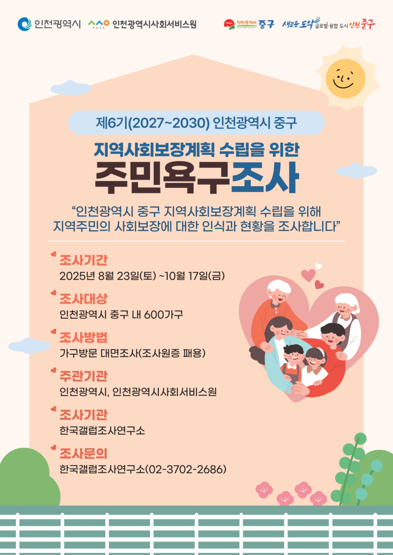 내년 6기(2027~2030) 시, 군·구 지역사회보장계획 수립에 앞서 진행하는 것으로 ‘사회보장급여의 이용·제공 및 수급권자 발굴에 관한 법률’에 따른 법정 조사다. 인천시 사회보장정책 방향을 설정하는 기초 자료로 활용한다.