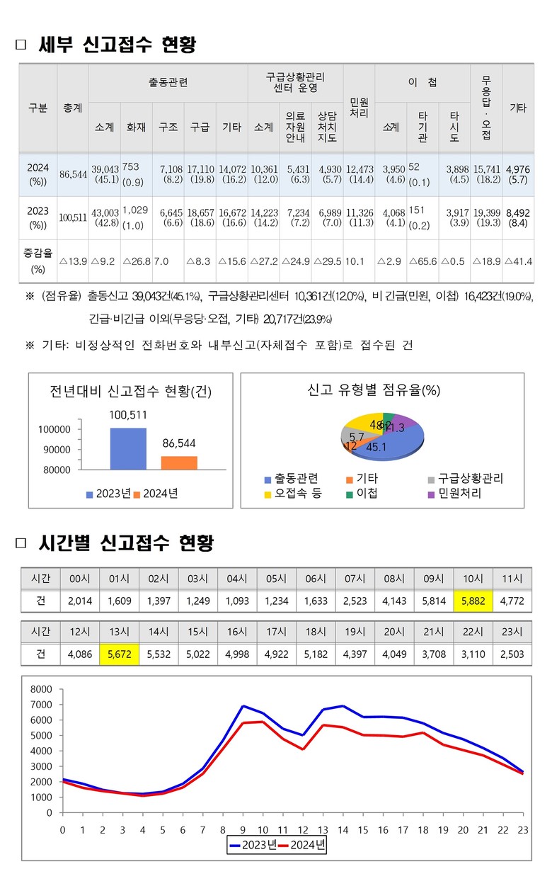 신고 유형별로는 화재·구조‧구급 등 현장 출동 신고가 전체의 45.1%인 3만 9,043건을 기록했다.