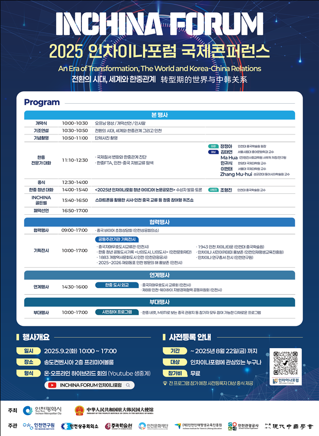 행사는 인천연구원, 인천상공회의소, 인천문화재단, 인천관광공사, 인천인재평생교육진흥원, 인천대 중국학술원, 현대중국학회 등 관련 기관과 학술단체가 함께 참여한다.