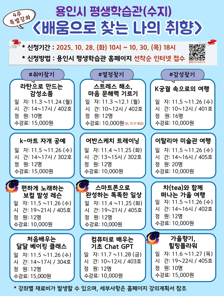 용인시 관계자는 “시민들이 배움의 즐거움을 느낄 수 있도록 실용적이고 유익한 교육 프로그램을 꾸준히 확대해 나가겠다”고 말했다.