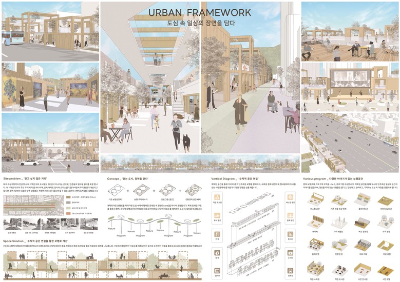 금상은 이동욱·박미성 씨의 ‘URBAN FRAMEWORK : 도심 속 일상의 장면을 담다’로, 수직적인 공공공간 조성을 통해 선형적인 보행 이동을 3차원 보행 경험으로 확장한 점이 높이 평가됐다.